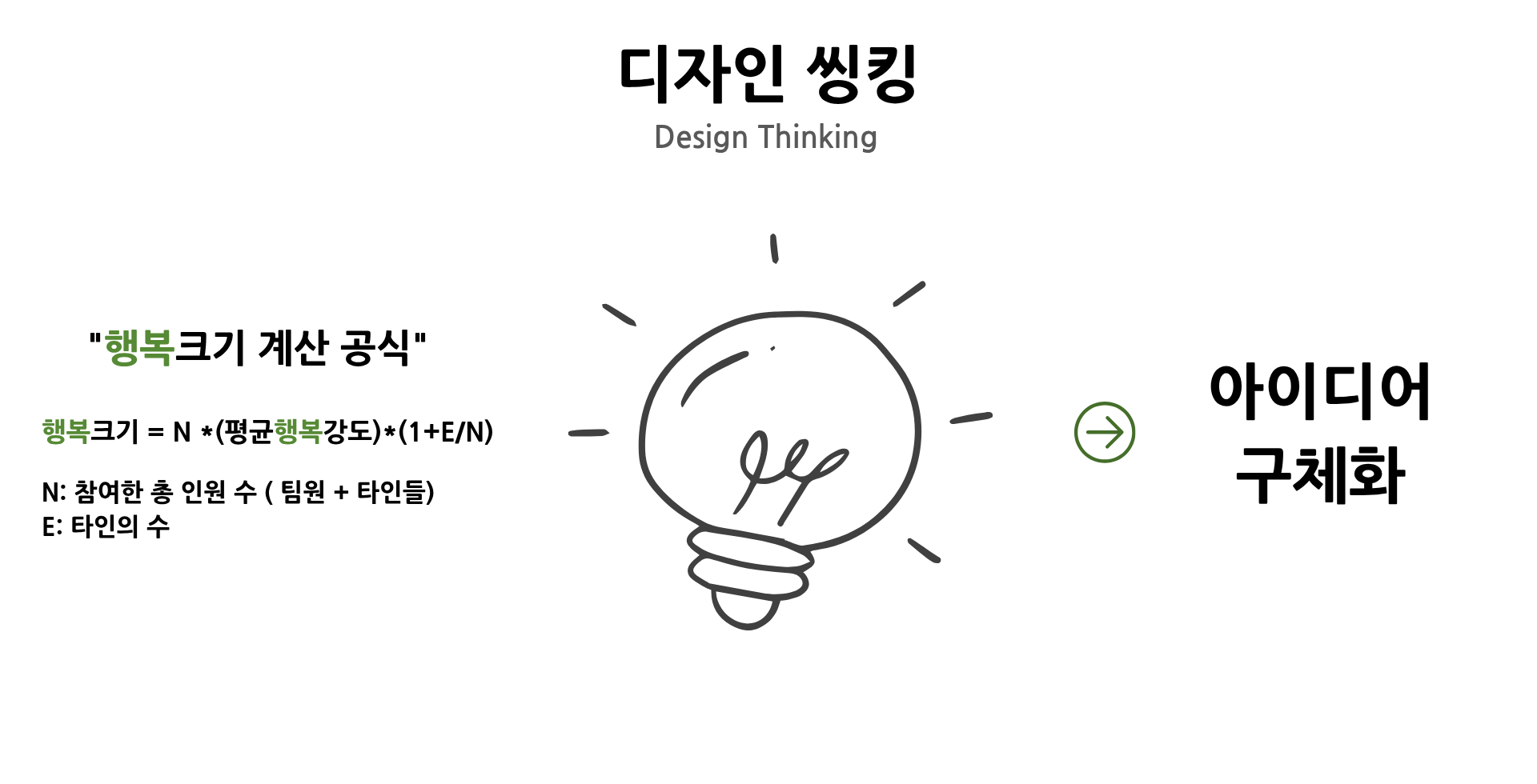 행복의 크기는 행복 크기 = N × (평균 행복 강도) × (1 + E/N)의 공식으로 산출됩니다. 여기서 N은 참여한 총인원수(우리 팀 + 타인), E는 타인의 수를 의미합니다.